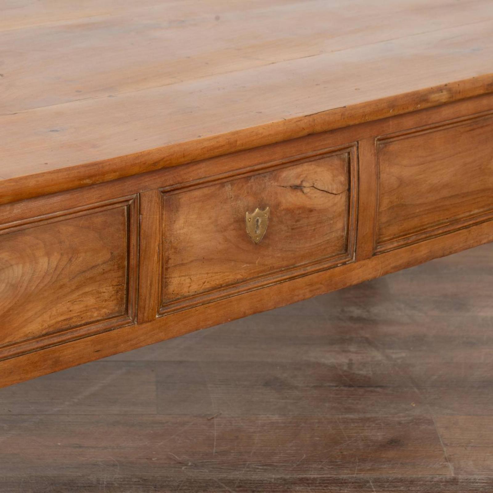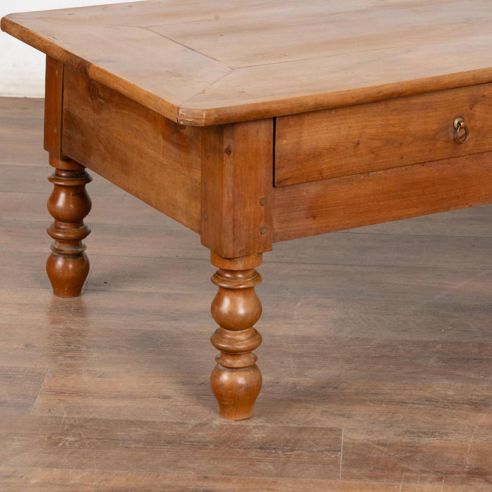 The beauty of this large two drawer French coffee table comes from the warm patina of the aged mahogany.