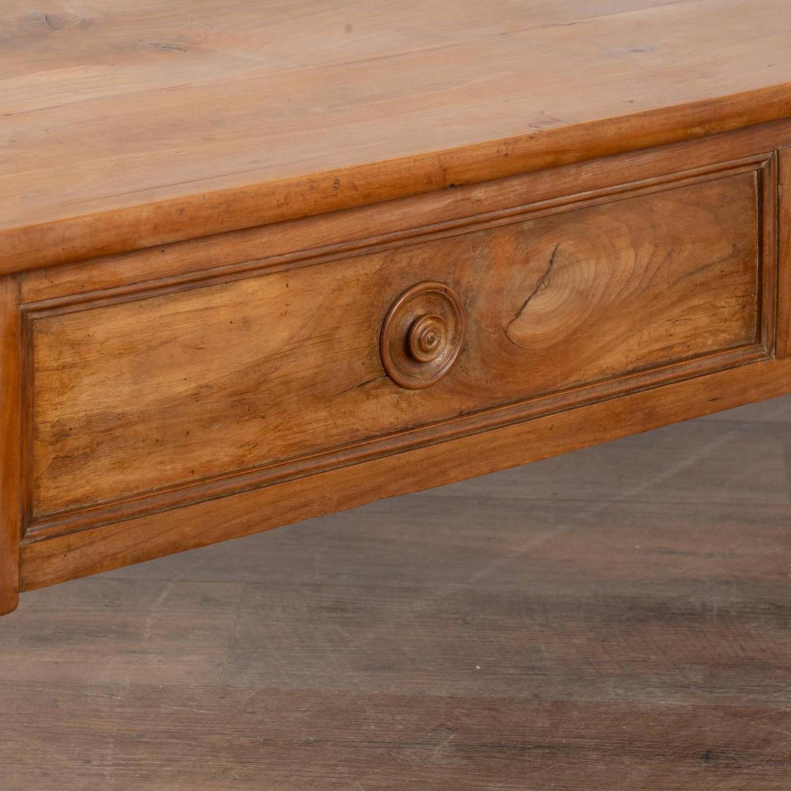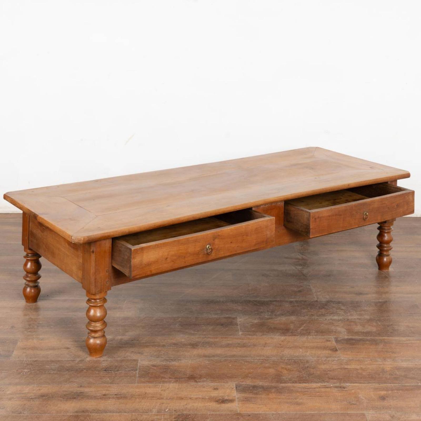 The beauty of this large two drawer French coffee table comes from the warm patina of the aged mahogany.